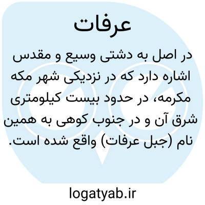 معنی: جای توقف حجاج در نزدیکی مکه، ( اَعلام ) ( = عرفه ) دشتی در حدود کیلومتری شرق مکه، در جنوب کوهی به همین نام، که حاجیان از ظهر تا غروب روز ذیحجه را در آن می گرانند