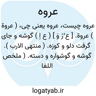 ( عروة ) عروة. [ ع ُرْ وَ ] ( ع اِ ) گوشه و جای گرفت دلو و کوزه. ( منتهی الارب ). گوشه و گوشواره و دسته. ( ملخص اللغات حسن خطیب کرمانی ). عروة از دلو و کوزه، دسته و مقبض آنهاست یعنی گوش و اذن آنها. ( از اقرب الموارد ). گوشه هر چیز و دسته هر چیز و دسته کوزه و آفتابه و هر چیز که مثل آن باشد که به دست میتوان گرفت. و کسانی که به معنی رسن گویند در هیچ کتاب دیده نشده، ظاهراً خطاست. ( غیاث اللغات ). دسته ابریق. ( فرهنگ فارسی معین ). || هر گونه حلقه که به دست گرفته شود، چنانکه گویند: و ذلک أوثق عری الایمان؛ یعنی آن محکم ترین دست آویزهای ایمان است. ( از اقرب الموارد ). دستاویز و مستمسک. ( فرهنگ فارسی معین ): چون رایات عالیه سایه بر آن دیار افکند اکثر ایشان به عروه دولت تمسک نمایند. ( جهانگشای جوینی ). || آنچه بدان اطمینان شود و بر آن اعتماد گردد، چنانکه گویند: الصحابة عری الاسلام یعنی صحابه مورد اعتماد و تکیه گاه در اسلام باشند. ( از اقرب الموارد ). || بهترین ِ مال، مانند اسب جواد. ( منتهی الارب ). مال نفیس چون اسب نجیب و کریم. ( از اقرب الموارد ). || عروةالثوب؛ تکمه جامه که اخت زره است. ( منتهی الارب ) ( آنندراج ). تکمه جامه که مقابل مادگی باشد. ( ناظم الاطباء ). تکمه جای پیراهن. جایی که تکمه پیراهن در آن وارد شود. || گوشت نمایان زیر تندی شرمگاه زن، که باریک گردیده به چپ و راست چسبد. ( از منتهی الارب ) ( از آنندراج ). گوشت نمایان در تندی میان فرج که باریک گردیده به چپ و راست می چسبد. ( ناظم الاطباء ). || گروه مردم. || درختستان بزرگ، و درختستان با خار بسیار. || گیاه شوره که شتر در تنگسال خورد. ( منتهی الارب ).«حمض » که در خشک سالی آن را چرا کنند. ( از اقرب الموارد ). || درختان انبوه و درهم پیچیده که درزمستان شتر در آن جای گیرد و خورد از آن. ( منتهی الارب ). درختان درهم پیچیده که شتران در آنجا زمستان کنند و از آن خورند. ( از اقرب الموارد ). || درخت، که برگش در زمستان نیفتد. و هر گیاه که در زمستان باقی باشد. ( منتهی الارب ). آنچه در زمستان برگش نریزد. ( از اقرب الموارد ). || گرداگرد شهر. ( منتهی الارب ). حوالی بلد. ( اقرب الموارد ). || شیر بیشه. ( منتهی الارب ). اسد. ( اقرب الموارد ).