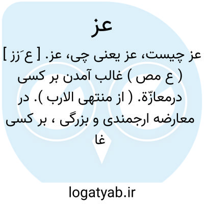 عز. [ ع َزز ] ( ع مص ) غالب آمدن بر کسی درمعازّة. ( از منتهی الارب ). در معارضه ارجمندی و بزرگی، بر کسی غالب شدن. ( از اقرب الموارد ). غلبه کردن.( تاج المصادر بیهقی ) ( المصادر زوزنی ). || با هم چیرگی کردن در خطاب. ( از منتهی الارب ). غلبه کردن کسی را در خطاب و احتجاج. ( از اقرب الموارد ). گویند: اذا عز أخوک فهُن؛ یعنی هرگاه برادرت چیره گردد و در پاداشش نتوانی، نرمی و ملاطفت کن. ( منتهی الارب ). یعنی اگر برادرت بر تو غلبه کرد و برابری با او نتوانی، پس با او نرمی کن. ( از اقرب الموارد ). و در مثل گویند: مَن ْ عَزَّ بَزّ؛ یعنی هرکه غالب آمد بُرد.( منتهی الارب ). یعنی هرکه غلبه کند می رباید. ( از اقرب الموارد ). || گویند: جی به عزاً بزاً؛ یعنی بی شک. ( منتهی الارب ). یعنی لامحاله او را آوردند. || قوی و توانا کردن. ( از اقرب الموارد ). || تنگ شدن سوراخ پستان شتر. ( تاج المصادر بیهقی ). عُزوز. عِزاز. رجوع به عزوز و عزاز شود.