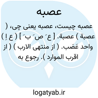 (بروزن فرس) رگ. معصوب: بسته شده با رگ. آنگاه بهر بستن عصب (بر وزن فلس) گفته‏اند «یَوْمٌ عَصیبٌ» یعنی شدید (گوئی اطراف آن با مشکلات جمع و بسته شده است) عصبة: جماعت فشرده و کمک همدیگر (مفردات).. یوسف و برادرش به پدرمان از ما محبوبتراست حال آن که ما دسته نیرومندیم در جوامع‏الجامع فرموده: جماعت را از آن عصبه گفته‏اند که کارها به وسیله آنها بسته و روبراه می‏شود.. لوط به وسیله فرستادگان به تنگی افتاد و گفت امروز روز سختی است. عصیب یکبار و عصبة چهار بار در قرآن مجید آمده است:،،.