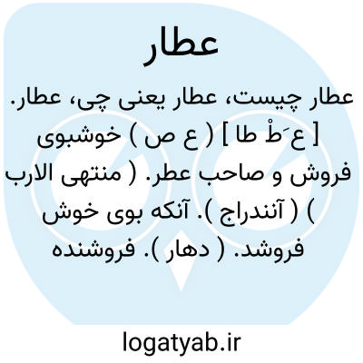 عطار. [ ع َطْ طا ] ( ع ص ) خوشبوی فروش و صاحب عطر. ( منتهی الارب ) ( آنندراج ). آنکه بوی خوش فروشد. ( دهار ). فروشنده عطر. ( از اقرب الموارد ). بوی خوش فروش. ( مهذب الاسماء ). بوی فروش. صیدلانی. صیقبانی: عطارها، سازندگان و فروشندگان عطریات و دهنیات معطره می باشند. ( از قاموس کتاب مقدس ):