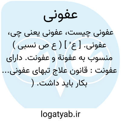 عفونی. [ ع ُ ] ( ع ص نسبی ) منسوب به عفونة و عفونت. دارای عفونت: قانون علاج تبهای عفونی... بکار باید داشت. ( ذخیره خوارزمشاهی ). رجوع به عفونت و عفونة و تب عفونی شود.