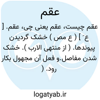 (بر وزن قفل) خشکیدن. راغب گفته: عقم خشک شدنی است که مانع از قبول اثر باشد گویند «عقمت مفاصله» بندهای بدنش خشکید. و به دردی که قابل صحت نیست گویند: «داء عقام» از زنان کسی را عقیم گویند که نطفه مرد را قبول نکند.(نازا).. زنش صیحه زنان آمد و با تعجّب به صورتش زد و گفت: پیرزن عقیم می‏زاید؟!. هر که را خواهد عقیم می‏کند آیه شامل زنان و مردان است.. «یَوْمٍ عَقیمٍ» روزی است که خیری و سروری در آن نیست و فرح و شادی نمی‏زاید ظهور آن می‏رساند که مراد عذاب دنیاست.. عقیم ظاهراً به معنی فاعل است گفته‏اند «ریح عقیم» بادی که ابر باران‏ده نیاورده و ابرها و درختان را تلقیح نکند یعنی خیری نزاید قرآن درباره بادها فرموده:... و اگر بادی باشد که هیچ یک از فایده‏ها را نداشته باشد پس آن از زائیدن فایده عقیم است باد قوم عاد چنین بادی بوده است. گفته‏اند: «اَلْمُلْکُ عَقیمٌ» یعنی حکومت نازا است زیرا پدر برای پادشاهی پسرش را می‏کشد. این لفظ فقط چهار بار در قرآن مجید آمده است.