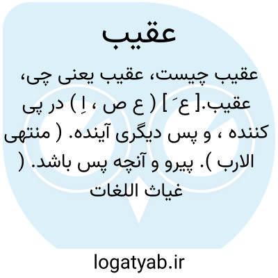 عقیب.[ ع َ ] ( ع ص، اِ ) در پی کننده، و پس دیگری آینده. ( منتهی الارب ). پیرو و آنچه پس باشد. ( غیاث اللغات ) ( آنندراج ). دنبال. دنباله. ( فرهنگ فارسی معین ). معاقب؛ یعنی در پس آینده و به دنبال آینده. و گفته فقها «یفعل ذلک عقیب الصلاة» بتقدیر محذوف است یعنی «فی وقت عقیب وقت الصلاة». ( از اقرب الموارد ): بعد از آن عقیب آن نصیحت خالص از ریا و صادقانه. ( ترجمه ٔمحاسن اصفهان ص 94 ). بیشتر علما گفتند مراد تکبیر عید است عقیب چهار نماز شام و خفتن و بامداد و نماز عید در عید فطر. ( تفسیر ابوالفتوح رازی ج 1 ص 295 ).