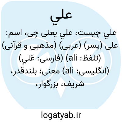 معنی: بلندقدر، شریف، بزرگوار، برتر، توانا، سخت و قوی، از نام های پروردگار، نام امام اول شیعیان، علی: از نام های خداوند متعال است «وهو العلی العظیم» به معنای بلند قدر و شریف است و نیز به معنای شدید، محکم و ارجمند بکار رفته است، علی: نام اولین امام شیعیان است و کنیه او ابوالحسن و ابوتراب و ملقب به مرتضی، حیدر کرار و امیرالمومنین می باشد، مولا علی ( ع ) پسر عمو و داماد پیامبر اکرم ( ص ) در دوران حکومت ساله خود الگوی کاملی از حکومت و مدیریت اسلامی را از خود به یادگار نهاد که در نهج البلاغه اثر گرانبهای آن بزرگواری جمع آوری شده است، هر کس نام او «علی» باشد و حرمت این نام را حفظ کند از رفعت طبع و مروت و عدالتخواهی وعشق به حقیقت آفرینش بهره مند خواهد شد خداوند متعال به حرمت این نام عنایت ویژه ای به او و خاندانش خواهد کرد، همچنین خانواده ای که با نام علی بر روی فرزندان خود به یاد مظلومیت و تنهائی مولا علی ( ع ) باشند و قلب خود را به کانون ولایت او نزدیک کنند، خدای متعال نور معرفت خود را در قلب آنان شعله ور می سازد و مولای متقیان علی ( ع ) را ضامن عبور آنان از پل صراط خواهد کرد، کسانیکه نامشان «علی» است اگر اهل طهارت و دائم الوضو باشند «علی» بعنوان یکی از اسماء الهی مربی نفوس آنان خواهد شد و سبوهای جانشان را از علم لدن پرخواهد کرد و هوشمندی و فراگیری علوم در آنان زبان زد خاص و عام خواهد شد و از سلامت روان و صلابت نفس قابل ملاحظه ای بهره مند خواهند شد بویژه در فردای قیامت که همه دل ها لرزان و همه چشم ها گریان است، عَلَم شفاعت مولا بر سر آنان برافراشته خواهد شد، یارب به علی دل مرا شیــدا کن فـارغ ز تــمام لـذت دنـیا کن یک قطره زعلم او به جانم افشان این سینه کوچک مرا دریا کن، ( عربی ) بلند، بلند بر آمده، بزرگ، کلان، نامی از نام های خدای تعالی، ( در اعلام ) نام امیرالمؤمنین علی ( ع )