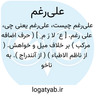 علی رغم. [ ع َ لا رَ م ِ ] ( حرف اضافه مرکب ) بر خلاف میل و خواهش. ( از ناظم الاطباء ) ( از آنندراج ). به ناخواست. به ناخواه. بررغم. نه بر میل: