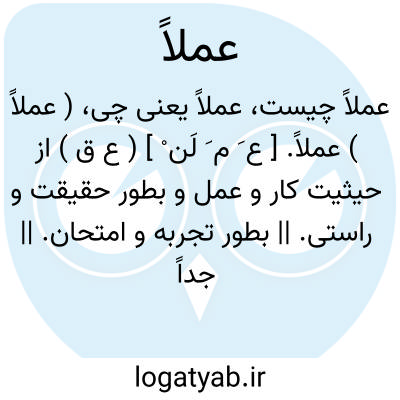 ( عملاً ) عملاً. [ ع َ م َ لَن ْ ] ( ع ق ) از حیثیت کار و عمل و بطور حقیقت و راستی. || بطور تجربه و امتحان. || جداً و بطور جدّ. ( ناظم الاطباء ). در عمل.