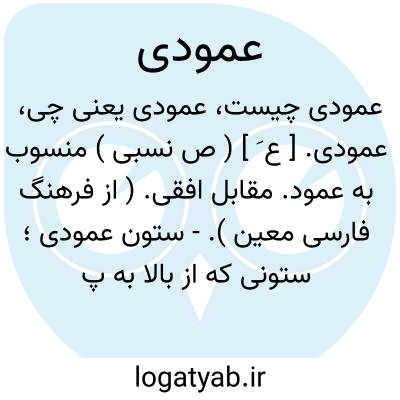عمودی. [ ع َ ] ( ص نسبی ) منسوب به عمود. مقابل افقی. ( از فرهنگ فارسی معین ).