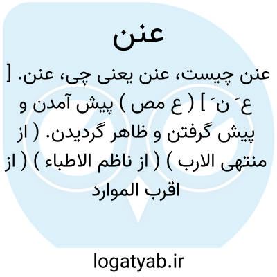 عنن. [ ع َ ن َ ] ( ع مص ) پیش آمدن و پیش گرفتن و ظاهر گردیدن. ( از منتهی الارب ) ( از ناظم الاطباء ) ( از اقرب الموارد ). عَن. عُنون. ( اقرب الموارد ) ( منتهی الارب ). رجوع به عَن و عنون شود.