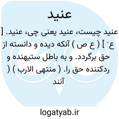 عنید. [ ع َ ] ( ع ص ) آنکه دیده و دانسته از حق برگردد. و به باطل ستیهنده و ردکننده حق را. ( منتهی الارب ) ( آنندراج ) ( از ناظم الاطباء ). شخص که مخالف حق باشد و آن را دانسته رد کند. ( از اقرب الموارد ). ج، عُنُد. ( اقرب الموارد ) ( منتهی الارب ). || سرکش. ( منتهی الارب ) ( آنندراج ) ( غیاث اللغات ) ( ناظم الاطباء ). || ناسازگار. ( فرهنگ فارسی معین ). || ستیزنده. ( غیاث اللغات ). ستیزه کننده. ( فرهنگ فارسی معین ). ستیزه کار. ستیزه گر. لجوج. لج باز. خیره سر. خیره چشم. عنود: