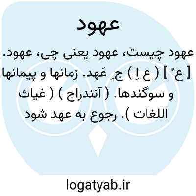 ۱ - ( مصدر ) شناختن امری را. یا عهد ذهنی. گاه در نظم و نثر اسم اشاره آن به کار می رود ولی مرجع آن مذکور نیست اما به قرینه شنونده و خواننده مفهوم آن را در می یابد دراین مورد آن به جای الف و لام عهد ذهنی و ذکری عربی آید و اصطلاحا آن را عهد ذهنی نامیده اند: بیامد نشست از بر تختگاه بسر نهاد آن کیانی کلاه. ( فردوسی ) ۲ - حفظ کردن نگهبانی کردن. ۳ - تفقد کردن. ۴ - وفا کردن وعده. ۵ - ( اسم ) شناسایی. ۶ - حفظ. ۷ - تفقد. ۸ - وفا. ۹ - ضمان. ۱٠ - امان. ۱۱ - مودت. ۱۲ - ( اسم ) سوگند قسم. ۱۳ - پیمان شرط میثاق. یا به عهد خود وفا کردن. ۱۴ - دوره زمان روزگار. یا عهد انجام دادن آن. بعید. زمان دور و دراز. یا عهد غریب. زمان نزدیک. ۱۵ - مدت معینی که سلسله ای از پادشاهان یا امرا در کشوری سلطنت کرده اند: عهد ساسانی عهد قاجاریه. ۱۶ - مدت پادشاهی یک شاه وزارت یک وزیر یا حکومت یک حاکم: عهد فتحعلی شاه عهد امیر کبیر عهد آقا بالا خان سردار. یا عهد دیانوس. بسیار قدیم. ۱۷ - هر یک از ادوار تاریخ طبیعی عصر دوره: عهد آهن عهد حجر جمع: عهود. توضیح تقسیمات بزرگ زمین شناس را گویند به طوری که طبقات مختلف زمین را از لحاظ تشخیص بقایای موجودات زنده قدیم تا کنون به ۴ عهد ( دوران ) تقسیم می کنند و آن قسمت از طبقات زمین را که قدیمتر از عهد ( دوران ) اول است به دوران ماقبل کامبرین موسوم کرده اند دوران.