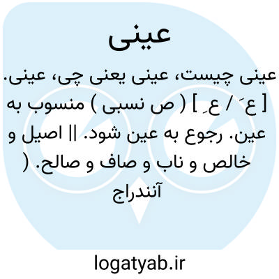 عینی. [ ع َ / ع ِ ] ( ص نسبی ) منسوب به عین. رجوع به عین شود. || اصیل و خالص و ناب و صاف و صالح. ( آنندراج ).اصلی و حقیقی و خالص. || هر چیز که تعلق به ذات و عین گیرد. ( ناظم الاطباء ). در مقابل ذهنی.