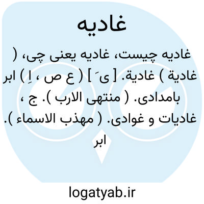 ( غادیة ) غادیة. [ ی َ ] ( ع ص، اِ ) ابر بامدادی. ( منتهی الارب ). ج، غادیات و غوادی. ( مهذب الاسماء ). ابر که بامداد برآید. ( دهار ). ابری که بامداد پیدا شود. ( غیاث از لطائف و صراح ). || باران بامدادی. ( منتهی الارب ). باران بامداد. باران صبحگاهی. باران بامدادین. ( دستور اللغة ). ضد رائحة. او مطر الغداة و یقابلها الرائحة. ( اقرب الموارد ):