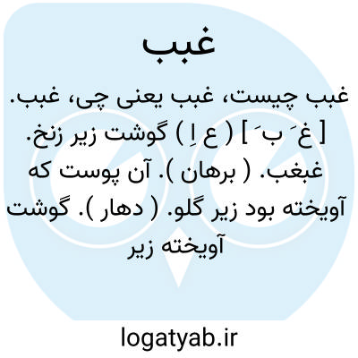 غبب. [ غ َ ب َ ] ( ع اِ ) گوشت زیر زنخ. غبغب. ( برهان ). آن پوست که آویخته بود زیر گلو. ( دهار ). گوشت آویخته زیر ذقن و آن را طوق گلو نیز گویند و آن از لوازم حسن است. ( غیاث ) ( آنندراج ).گوشتی که زیر گلوی خروس و گاو فربه آویخته است. طوق زیر گلوی خروس و گاو و مردم. ( منتهی الارب ). در خراسان از آن خروس را «لاری » و از آن مردم را غبغب و دو گلوله مانند دراز زیر گلوی بُز را دِگلون گویند: