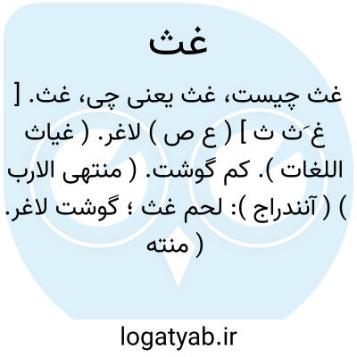 غث. [ غ َث ث ] ( ع ص ) لاغر. ( غیاث اللغات ). کم گوشت. ( منتهی الارب ) ( آنندراج ): لحم غث؛ گوشت لاغر. ( منتهی الارب ). و تأنیث آن غثة. ( اقرب الموارد ). مقابل سمین. غث و سمین؛ لاغر و فربه. || سخن تباه. ( منتهی الارب ) ( آنندراج ): حدیث غث؛ سخن تباه. ( منتهی الارب ). حدیث غث؛ سخن ناخوش. ج، اَغِثّاء. ( بنقل دزی ): قاصدان از قصداربر کار کرد، و میفرستاد سوی بلخ، و غث و سمین می بازنمود عبدوس را پنهان. ( تاریخ بیهقی چ غنی ص 250 ).