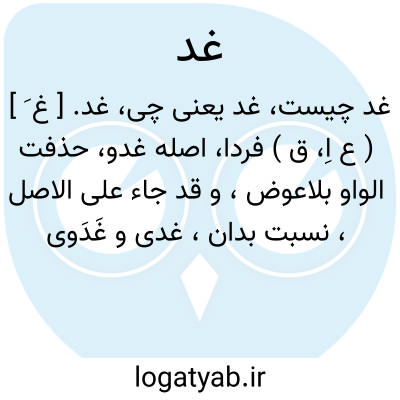 غد. [ غ َ ] ( ع اِ، ق ) فردا، اصله غدو، حذفت الواو بلاعوض، و قد جاء علی الاصل، نسبت بدان، غدی و غَدَوی. ( منتهی الارب ). و النسبة الیه غدی و ان شئت قلت غدوی. ( اقرب الموارد ). منسوب آن غدی به حذف آخر، و غدوی بر اصل می آید. ( از شرح قاموس ). || از نظر توسع به زمان بعید مترقب نیز اطلاق می کنند. ( اقرب الموارد ): و لتنظر نفس ما قدمت لغد. ( قرآن 18/59 ). || کنایه از روز قیامت است: ان النبی ( ص ) ابصر ناقة معقولة و علیها جهازها فقال: این صاحبها لامروة له، فلیستعد غداً للخصومة. ( مکارم الاخلاق طبرسی ).