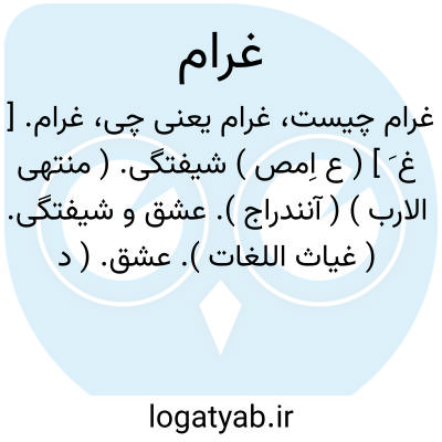 غرام. [ غ َ ] ( ع اِمص ) شیفتگی. ( منتهی الارب ) ( آنندراج ). عشق و شیفتگی. ( غیاث اللغات ). عشق. ( دهار ). عشق دلسوز. الحب المعذب للقلب. ( اقرب الموارد ). || آزمندی. ( منتهی الارب ) ( آنندراج ). حرص. ( غیاث اللغات ). ولوع. ( اقرب الموارد ). || هلاک. ( منتهی الارب ) ( غیاث اللغات ) ( آنندراج ). منه قوله تعالی: ان عذابها کان غراماً. ( قرآن 65/25 )؛ ای هلاکاً و لزاماً لهم. ( منتهی الارب ). الهلاک و العذاب. ( نشوء اللغة العربیة ص 4 ). || ( اِ ) عذاب. ( منتهی الارب ) ( غیاث اللغات ) ( اقرب الموارد ). || بدی پیوسته. ( منتهی الارب ) ( آنندراج ).شر دائم. ( اقرب الموارد ). || لازم. ( ترجمان علامه جرجانی تهذیب عادل ص 73 ). آنچه رهائی از آن ممکن نیست. ما لایستطاع ان یتقضی منه. ( لسان العرب به نقل ذیل اقرب الموارد ).