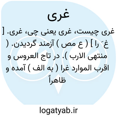غری. [ غ َ را ] ( ع مص ) آزمند گردیدن. ( منتهی الارب ). در تاج العروس و اقرب الموارد غرا ( به الف ) آمده و ظاهراً صاحب منتهی الارب به اشتباه رفته است. حریص شدن. مولع شدن. ( مصادر زوزنی ). حریص شدن به چیزی بی آنکه وادارکننده ای باشد.( اقرب الموارد ). غِراء. ( منتهی الارب ) ( تاج العروس ).غَراء. ( تاج العروس ) ( اقرب الموارد ). || سرد شدن آب چشمه. ( منتهی الارب ) ( اقرب الموارد ). در تاج العروس و اقرب الموارد «غرا» به الف آمده است.