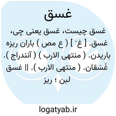 غسق. [ غ َ ] ( ع مص ) باران ریزه باریدن. ( منتهی الارب ) ( آنندراج ). غَسَقان. ( منتهی الارب ). || غسق لبن؛ ریزان گردیدن شیر از پستان. نیک تاریک شدن شب. ( منتهی الارب ) ( آنندراج ). سخت تاریک شدن شب. ( اقرب الموارد ). غَسَق. غَسَقان. ( منتهی الارب ). || غسق جراحت؛ دویدن زرداب از آن. ( تاج المصادر بیهقی ). غسق الجرح غسقاً و غسقاناً؛ سال منه شی اصفر. ( اقرب الموارد ). || غسق عین؛ دویدن آب از چشم و تاریک شدن آن. ( تاج المصادر بیهقی ) ( دهار ). غسقت العین غسقاً؛ دمعت و أظلمت. ( المنجد ).