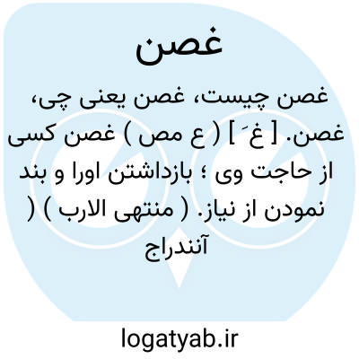 غصن. [ غ َ ] ( ع مص ) غصن کسی از حاجت وی؛ بازداشتن اورا و بند نمودن از نیاز. ( منتهی الارب ) ( آنندراج ). منحرف کردن و بازداشتن کسی را از حاجت وی. و ماغصنک عنی؛ ای ماشغلک. ( اقرب الموارد ). || شاخ ( شاخه ) را به سوی خود کشیدن. ( منتهی الارب ) ( آنندراج ) ( از اقرب الموارد ). || غصن شاخه؛ بریدن آن را، یا عام است. ( منتهی الارب ) ( آنندراج ). بریدن و برگرفتن شاخه. ( از اقرب الموارد ). شاخ بریدن. ( تاج المصادر بیهقی ). || غصن چیزی؛ گرفتن آن را. ( منتهی الارب ) ( آنندرج ). برگرفتن چیزی را یا بریدن آن را. ( از اقرب الموارد ).