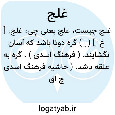 غلج. [ غ َ ] ( اِ ) گره دوتا باشد که آسان نگشایند. ( فرهنگ اسدی ). گره به علقه باشد. ( حاشیه فرهنگ اسدی چ اقبال ). گره غلچ. ( حاشیه برهان قاطع ):