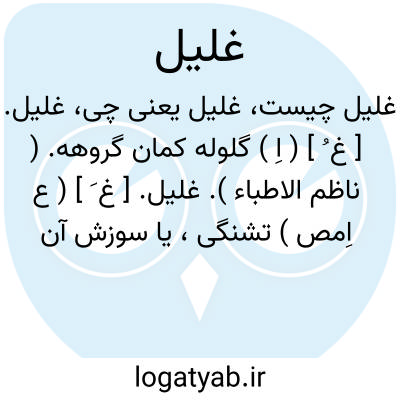 غلیل. [ غ َ ] ( ع اِمص ) تشنگی، یا سوزش آن. سوزش شکم. ( منتهی الارب ) ( آنندراج ). عطش، یا شدت عطش و یا حرارت آن. ( از اقرب الموارد ). سوزش درون. || ( اِ ) کینه و دشمنی. || خسته ٔخرما با سپست کوفته بجهت ستور. ( منتهی الارب ) ( آنندراج ). هسته خرما که با سپست مخلوط کنند برای شتر. ( از اقرب الموارد ). || سوزش دوستی و گرمی اندوه. ( منتهی الارب ) ( آنندراج ). حرارت دوستی و اندوه. ( از اقرب الموارد ). || جای روییدن طلح و سلم و یا وادیی پست. ( منتهی الارب ) ( آنندراج ). یکی غلاّن. ( اقرب الموارد ). رجوع به غلاّن شود. || ( ص ) تشنه. ( غیاث اللغات ) ( دهار ) ( منتهی الارب ). سوخته تشنگی. ( منتهی الارب ) ( آنندراج ). عطشان. ( اقرب الموارد ). مغلول: