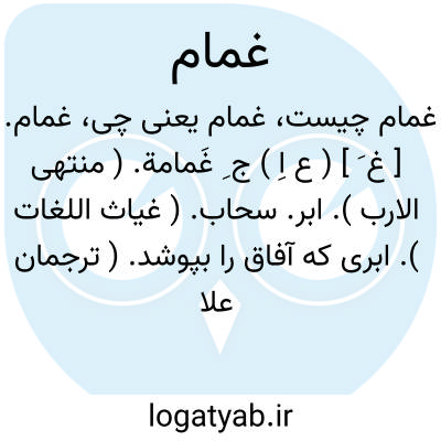 ( اسم ) جمع غمامه ۱ - ابر سحاب ۲ - ابر سفید ۳ - اسفنج دریایی ۴ - رسوبی که بالای قاروره باشد ۵ - سفیدی رقیقی که بر چشم افتد.