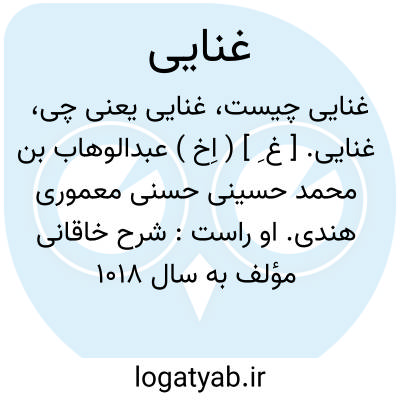 غنایی. [ غ ِ ] ( اِخ ) عبدالوهاب بن محمد حسینی حسنی معموری هندی. او راست: شرح خاقانی مؤلف به سال 1018 هَ. ق. رجوع به الذریعه ج 9 ص 792 شود.