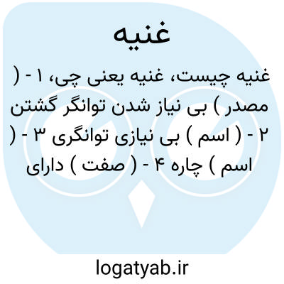 (غَ یَ یا یِ ) [ ع. غنیة. ] ۱ - (مص ل. ) بی نیاز شدن، توانگر شدن. ۲ - (اِمص. ) بی نیازی، توانگری. ۳ - (اِ. ) چاره. ۴ - (ص. ) دارای جمال یا مال فراوان.