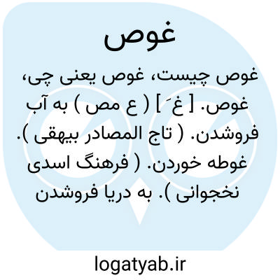 غوص. [ غ َ ] ( ع مص ) به آب فروشدن. ( تاج المصادر بیهقی ). غوطه خوردن. ( فرهنگ اسدی نخجوانی ). به دریا فروشدن. ( ترجمان علامه جرجانی تهذیب عادل ). در آب فروشدن. ( منتهی الارب ). در آب غوطه زدن. ( غیاث اللغات ) ( آنندراج ). رفتن در زیر آب. غطس. ( از اقرب الموارد ). غوته خوردن. در آب فروشدن. بلک خوردن. ناغوش خوردن. غیاص. غیاصة. مَغاص. غمس. قمس. رجوع به غواص، غواصة و غوصة شود. || فرورفتن. داخل شدن در چیزی: غاص فی الارض. ( دزی ج 2 ص 231 ). || غوص بر مروارید؛در آب فرورفتن برای بیرون آوردن آن. ( از اقرب الموارد ). صید مروارید: غاص علی اللؤلؤ. ( دزی ج 2 ص 231 ). || دانستن. یقال: غاص علی الامر؛ ای علمه.( منتهی الارب ) ( آنندراج ). غوص بر معانی، رسیدن بغایت و غور آنها و استخراج آنچه از نظر دور است، گویند: هو یغوص علی حقائق العلم، و ما احسن غوصه علیها. ( ازاقرب الموارد ). غور کردن در دانش. ( دزی ج 2 ص 231 ). || ناگاه بر چیزی آمدن. ( منتهی الارب ) ( آنندراج ). غوص بر چیزی. هجوم کردن بر آن. ( از اقرب الموارد ). ناگاه بر چیزی فرودآمدن. || غاص فی الحدید؛ بمجاز، در آهن فرورفت، پوشیده شد از آهن، در موردی گویند که کسی زرهی سنگین بر تن کند و با آن کاملاً خود را فروپوشد. || ناپدید شدن از نظر. گم شدن. در موردی گویند که سخن از رودی باشد که درشنها فرورود یا به دریاچه ریزد یا در زیر زمین جاری گردد. و فعل «غاض َ یغیض » نیز به همین معنی استعمال شود. || ( اِ ) زمین شنزار. بیابان ریگزار، بخصوص توده ریگ که در آن فروروند. ( دزی ج 2 ص 231 ).