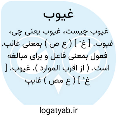 غیوب. [ غ َ ] ( ع ص ) بمعنی غائب. فعول بمعنی فاعل و برای مبالغه است. ( از اقرب الموارد ).
