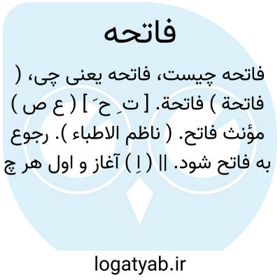 ( فاتحة ) فاتحة. [ ت ِ ح َ ] ( ع ص ) مؤنث فاتح. ( ناظم الاطباء ). رجوع به فاتح شود. || ( اِ ) آغاز و اول هر چیز.( منتهی الارب ). مقابل خاتمه. ج، فواتح: فاتحه چیزی؛آغاز آن که مابعدش بدان گشوده شود. فاتحةالکتاب از آن است، زیرا خواندن نماز بدان افتتاح شود. این کلمه در اصل مصدر است، چون کاذبه بمعنی کذب، یا وصف است که بعد آن را اسم قرار داده اند، و تای آخر آن یا در اصل برای تأنیث موصوف است یا برای نقل از وصفیت به اسمیت. ( اقرب الموارد ).