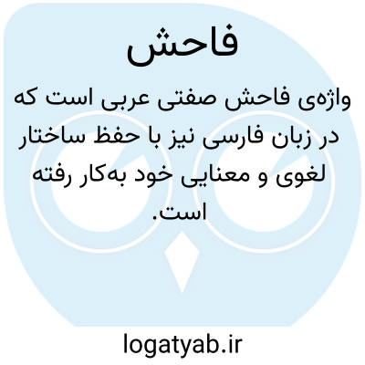 ( اسم صفت ) ۱ - زشت قبیح ۲ - آنچه از حد تجاوز کند زیاده از حد بسیار کثیر. یا تفاوت فاحش. تفاوت زیاد. یا غلط فاحش. غلط بسیار مهم و فاضح ۳ - بی شرف ۴ - جسور گستاخ.