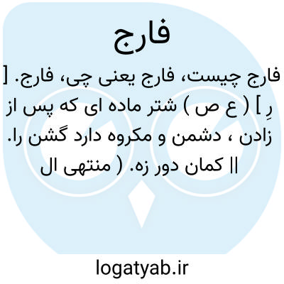 فارج. [ رِ ] ( ع ص ) شتر ماده ای که پس از زادن، دشمن و مکروه دارد گشن را. || کمان دور زه. ( منتهی الارب ). کمانی که از وتر خود دور باشد. || دورکننده اندوه. ( اقرب الموارد ). شادان.