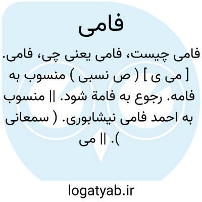 فامی. [ می ی ] ( ص نسبی ) منسوب به فامه. رجوع به فامة شود. || منسوب به احمد فامی نیشابوری. ( سمعانی ). || میوه فروش. ( تاریخ بیهقی ). رجوع به فامة شود. || شیرفروش. ( منتهی الارب ). ظاهراً درست به نظر نمیآید.