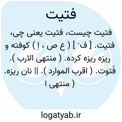 فتیت. [ ف َ ] ( ع ص، اِ ) کوفته و ریزه ریزه کرده. ( منتهی الارب ). فَتوت. ( اقرب الموارد ). || نان ریزه. ( منتهی الارب ) ( اقرب الموارد ). نان خشک است که بسیار نرم ساییده باشند و مستعمل آن از نان گندم است. قلیل الغذا و مخفِّف رطوبت معده و مولد ریاح و سواد و دیرهضم و مضر احشای ضعیفه است و کهنه او بسیار زبون تر و مورث قولنج و مسدّد، و مصلحش شکر است. ( تحفه حکیم مؤمن ). نان فتیر است که فتیت نیز نامند، و فتیت هر چیزی را نامند. ( فهرست مخزن الادویه ). رجوع به فَتوت شود.