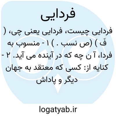 ( فَ ) (ص نسب. ) ۱ - منسوب به فردا، آ ن چه که در آینده می آید. ۲ - کنایه از: کسی که معتقد به جهان دیگر و پاداش و کیفر در آن است.