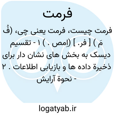 (فُ مَ ) [ فر. ] (اِمص. ) ۱ - تقسیم دیسک به بخش های نشان دار برای ذخیرة داده ها و بازیابی اطلاعات. ۲ - نحوة آرایش داده ها برای ذخیره یا نمایش.