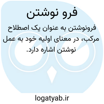 فرونوشتن به عنوان یک اصطلاح مرکب، در معنای اولیه خود به عمل نوشتن اشاره دارد. این مفهوم، که در یادداشت‌های مولف به آن ارجاع داده شده است، بیانگر فرایند ثبت و ضبط اندیشه‌ها، اطلاعات و مفاهیم بر روی کاغذ یا هر بستری دیگر است. این واژه، در بطن خود، هنر و مهارت انتقال افکار از ذهن به عالم خارج را در بر می‌گیرد و به همین دلیل، ارجاع به واژه بنیادی‌تر نوشتن در این تعریف، کاملاً منطقی و بجاست.