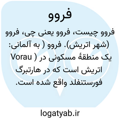 فروو (شهر اتریش). فروو ( به آلمانی: Vorau ) یک منطقهٔ مسکونی در اتریش است که در هارتبرگ فورستنفلد واقع شده است. فروو ۴٫۷۱ کیلومتر مربع مساحت دارد ۶۶۰ متر بالاتر از سطح دریا واقع شده است.