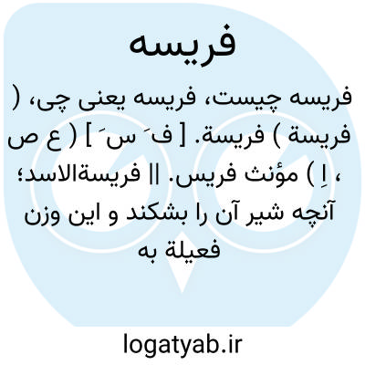 ( فریسة ) فریسة. [ ف َ س َ ] ( ع ص، اِ ) مؤنث فریس. || فریسةالاسد؛ آنچه شیر آن را بشکند و این وزن فعیلة به معنی مفعولة و تاء تأنیث برای معنی مبالغه است مثل نصیحت. ج، فرایس. ( از اقرب الموارد ).