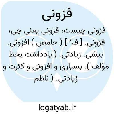 فزونی. [ ف ُ ] ( حامص ) افزونی. بیشی. زیادتی. ( یادداشت بخط مؤلف ). بسیاری و افزونی و کثرت و زیادتی. ( ناظم الاطباء ). فراوانی: