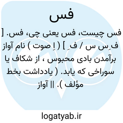 فس. [ ف ِس س / ف ِ ] ( اِ صوت ) نام آواز برآمدن بادی محبوس، از شکاف یا سوراخی که یابد. ( یادداشت بخط مؤلف ). || آواز خفیف اخراج باد از مخرج انسان یا حیوانات.