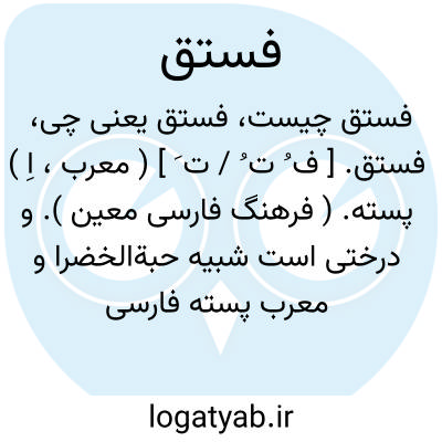 فستق. [ ف ُ ت ُ / ت َ ] ( معرب، اِ ) پسته. ( فرهنگ فارسی معین ). و درختی است شبیه حبةالخضرا و معرب پسته فارسی است. ( از اقرب الموارد ):