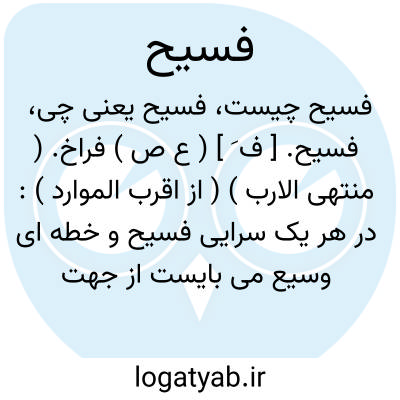 فسیح. [ ف َ ] ( ع ص ) فراخ. ( منتهی الارب ) ( از اقرب الموارد ): در هر یک سرایی فسیح و خطه ای وسیع می بایست از جهت فیالان و مرتبان طعام و کافلان حوائج. ( ترجمه تاریخ یمینی ).به موضعی فسیح عریض میرود. ( ترجمه تاریخ یمینی ).