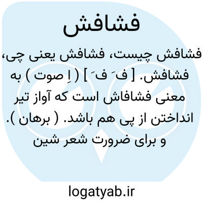 فشافش. [ ف َ ف َ ] ( اِ صوت ) به معنی فشافاش است که آواز تیر انداختن از پی هم باشد. ( برهان ). و برای ضرورت شعر شین اول مشدد شود: