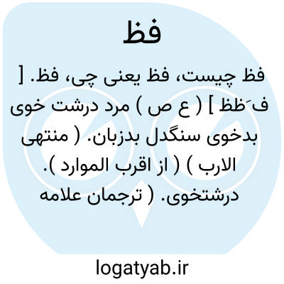 فظ. [ ف َظظ ] ( ع ص ) مرد درشت خوی بدخوی سنگدل بدزبان. ( منتهی الارب ) ( از اقرب الموارد ). درشتخوی. ( ترجمان علامه جرجانی ترتیب عادل بن علی ). || ( اِ ) آب شکنبه که در بیابان بی آب، شکم شتر کفانیده، سرگین افشارده بخورند. ( منتهی الارب ) ( از اقرب الموارد ). || ( مص ) بیفشاردن آب شکنبه را. ( منتهی الارب ).