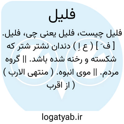 فلیل. [ ف َ ] ( ع اِ ) دندان نشتر شتر که شکسته و رخنه شده باشد. || گروه مردم. || موی انبوه. ( منتهی الارب ) ( از اقرب الموارد ). || لیف خرما. ( منتهی الارب ). در این معنی از کلمات بنی هذیل است. ( از اقرب الموارد ). || موی سر زنان. ( بحر الجواهر ). || ( ص ) سیف ٌ فَلیل؛ شمشیر بارخنه. ( منتهی الارب ) ( از اقرب الموارد ).