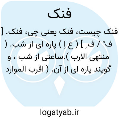 فنک. [ ف ُ / ف ِ ] ( ع اِ ) پاره ای از شب. ( منتهی الارب ).ساعتی از شب، و گویند پاره ای از آن. ( اقرب الموارد ). || در. ( منتهی الارب ) ( اقرب الموارد ). منتهی الارب در این معنی فقط به کسر اول ضبط کرده است.