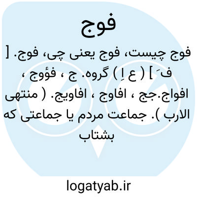 فوج. [ ف َ ] ( ع اِ ) گروه. ج، فؤوج، افواج.جج، افاوج، افاویج. ( منتهی الارب ). جماعت مردم یا جماعتی که بشتاب گذرد: و رأیت الناس یدخلون فی دین اﷲ افواجا ( قرآن 2/110 )؛ یعنی گروهی پس از گروه دیگر. ( از اقرب الموارد ): ترکمانان براثر می آمدند و فوجی بی بصیرت نمایشی میکردند. ( تاریخ بیهقی ). اگر شما فوجی بی بصیرت پیش روید طوسیان دست یابند و دل نشابوریان بشکند. ( تاریخ بیهقی ). فوجی لشکر قوی و مقدمی بانام فرستاده آمد. ( تاریخ بیهقی ).